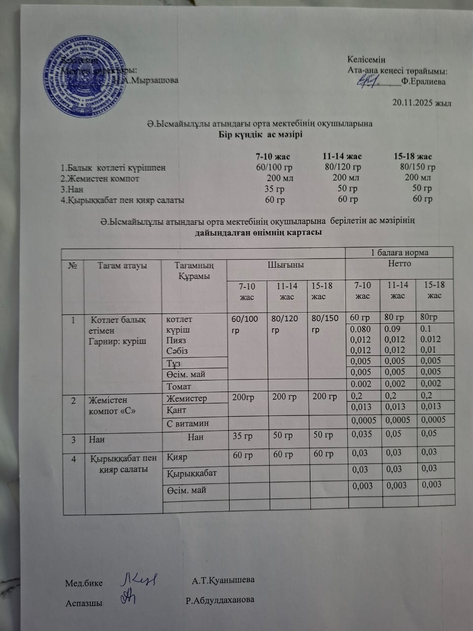 Бір күндік ас мәзірі